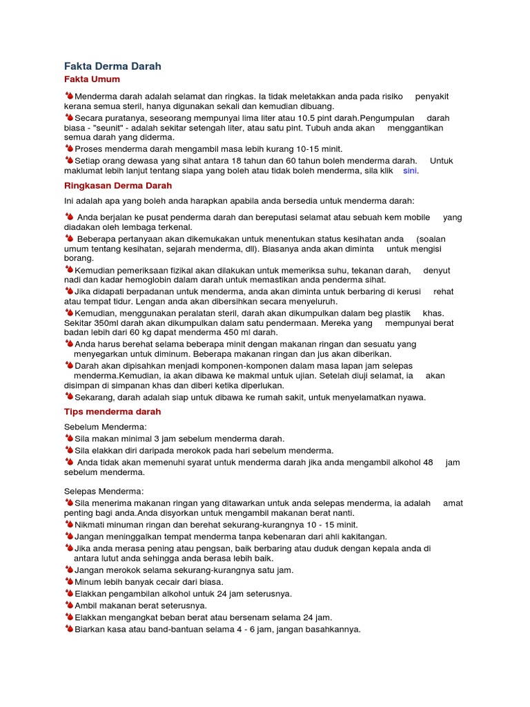 Antara syarat lain bagi penderma darah adalah seseorang itu mestilah sihat berat melebihi 50kg dan berumur antara 17 hingga 60 tahun. Dewan bahasa dan pustaka 2015. Derma darah terbahagi kepada dua iaitu pendermaan darah penuh whole blood dan pendermaan aferesis. Putrajaya orang ramai yang ingin menderma darah kini tidak mempunyai masalah untuk tampil ke mana mana hospital atau klinik kesihatan untuk tujuan tersebut.